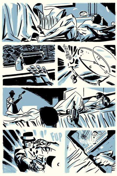 Cooke’s adaptation is apparently stays very close to the Parker novels, and retains the 1960s setting, but the most immediately remarkable feature is the artwork. Cooke, who has worked on wide range of comic and animation projects over the years, is a graphic designer by trade, and it shows – he cleverly chooses to illustrate the morally ambiguous criminal underworld in the style of 1960s graphic design and advertising, using a pallet of black, white and blue throughout. In some ways Cooke’s art is similar to the work of contemporary indie comic artists operating in a nostalgic mode (fellow Canadians Seth and Michel Rabagliati in particular), but combining it with the hard-boiled crime genre gives the images a thrilling kinetic energy. This distinctive visual style contrasts wonderfully with the bursts of often-brutal violence that pepper Parker’s misadventures, and help situate the story in a very particular, iconic version of its historical moment. (Fans of Mad Men will likely appreciate this!)