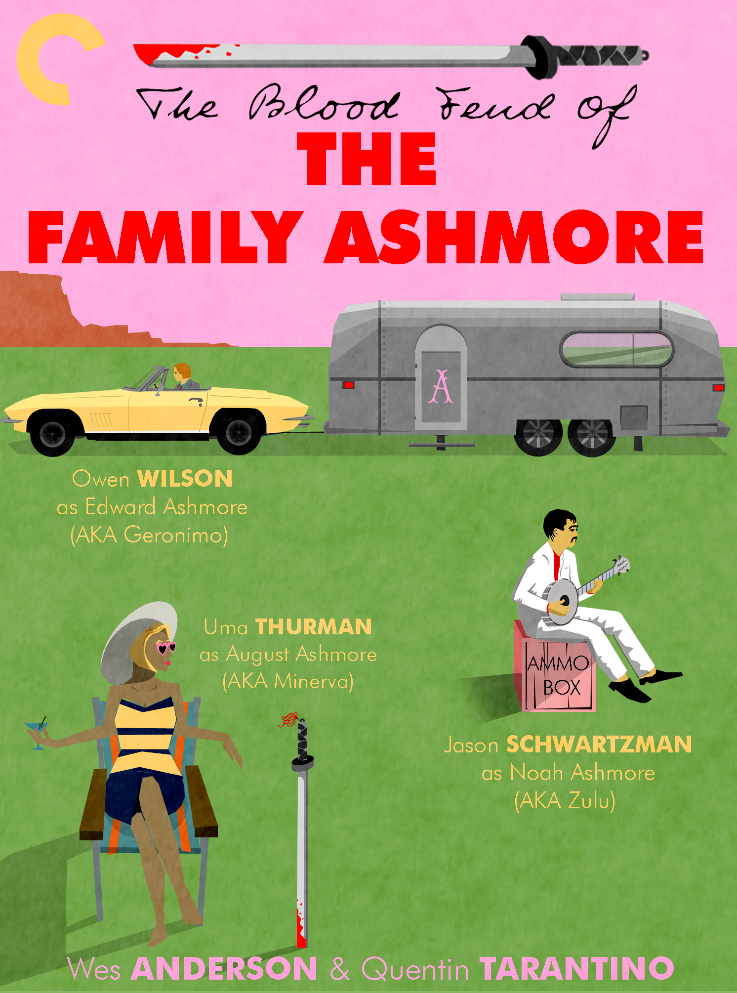 The Movie: A dysfunctional family of assassins reunites after the death of their patriarch (Bill Murray) to avenge his demise at the hands of a rival family of killers. The mother of the family’s three children (played by Anjelica Huston), a demolitions-expert-turned-tarot-card-reader long since divorced from their father, has remarried his business partner (played by Samuel L. Jackson) – himself an expert with all bladed weapons. The family’s three kids (played by Owen Wilson, Uma Thurman and Jason Schwartzman) are also weapons specialists, with the eldest (Owen Wilson) being a sniper obsessed with mathematics – specifically trajectories, the middle child and only daughter (Uma Thurman) being a martial artist who is also a part-time beekeeper, and the youngest kid (Schwartzman) a bored and nihilistic marksman who uses his late father’s blowgun and enjoys playing banjo. Together, the three of them vow to kill their father’s murderer (Gene Hackman) and have bloody revenge while also drinking espressos and keeping their shoes clean. Title: The Blood Feud of the Family Ashmore